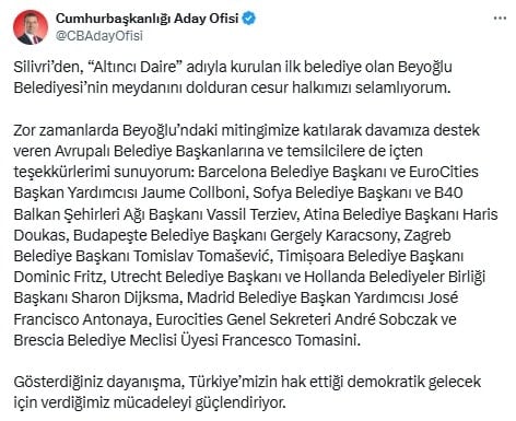 Zor zamanlarda Beyoğlu’ndaki mitingimize katılarak davamıza destek veren Avrupalı Belediye Başkanlarına ve temsilcilere de içten teşekkürlerimi sunuyorum: Barcelona Belediye Başkanı ve EuroCities Başkan Yardımcısı Jaume Collboni, Sofya Belediye Başkanı ve B40 Balkan Şehirleri Ağı Başkanı Vassil Terziev, Atina Belediye Başkanı Haris Doukas, Budapeşte Belediye Başkanı Gergely Karacsony, Zagreb Belediye Başkanı Tomislav Tomašević, Timișoara Belediye Başkanı Dominic Fritz, Utrecht Belediye Başkanı ve Hollanda Belediyeler Birliği Başkanı Sharon Dijksma, Madrid Belediye Başkan Yardımcısı José Francisco Antonaya, Eurocities Genel Sekreteri André Sobczak ve Brescia Belediye Meclisi Üyesi Francesco Tomasini.