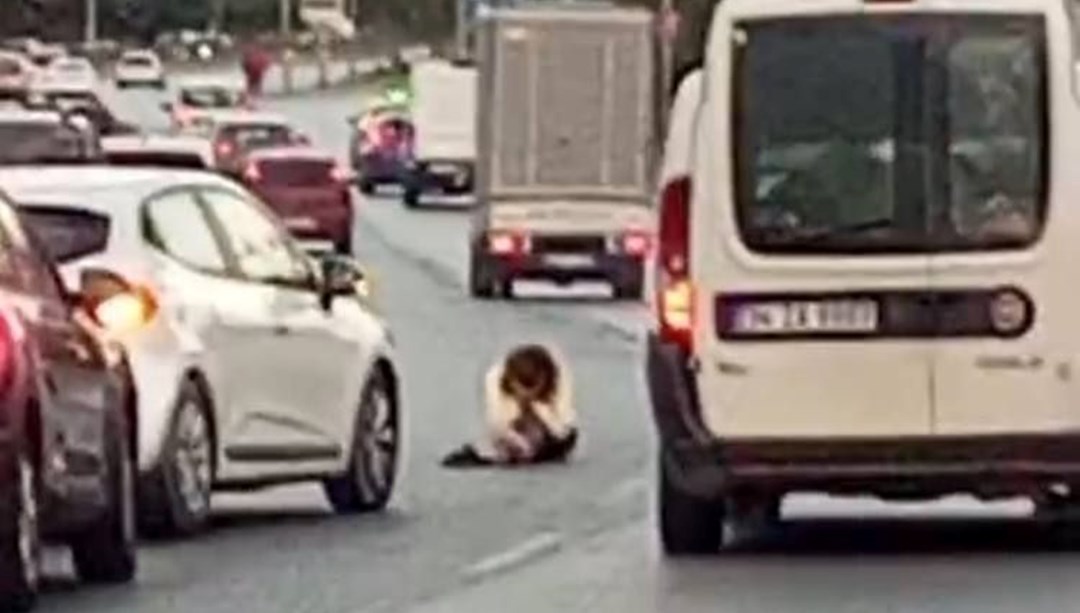 İstanbul Sultangazi’de bir kadın akan trafikte yola atladı, yere oturdu. Kaza yapmamak için manevra yapan sürücüler trafikte zor anlar yaşarken otobüs durağında bekleyenler kadını kaldırdı.