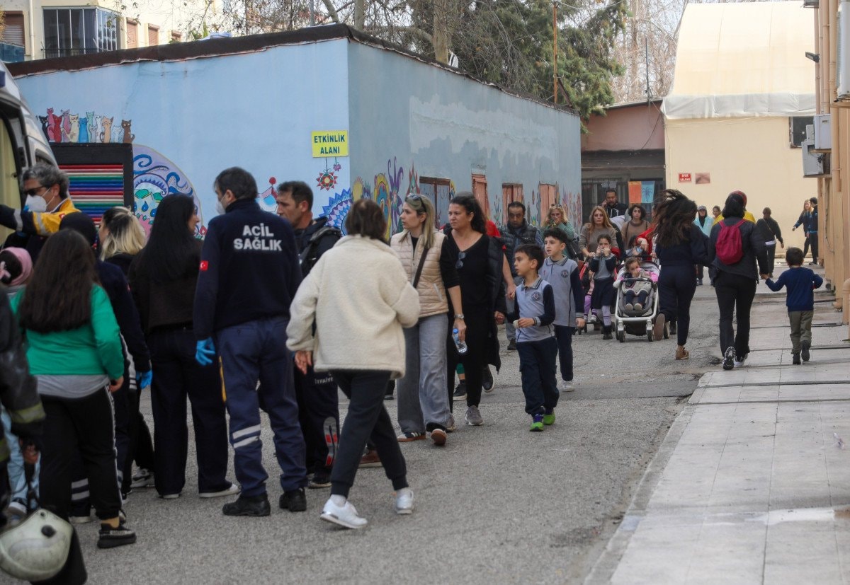 Okuldaki öğrenciler, kısa sürede tahliye edilerek bahçede toplandı.