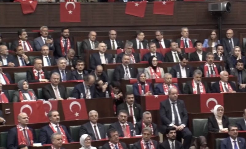 Türk bayrakları ile donatılan salonda, milli takım atkıları ile Cumhurbaşkanı Erdoğan’ı dinleyen milletvekili ve kabine uyeleri ve konuklar milli takımın galibiyet sevincini adeta bir kez daha yaşadı.